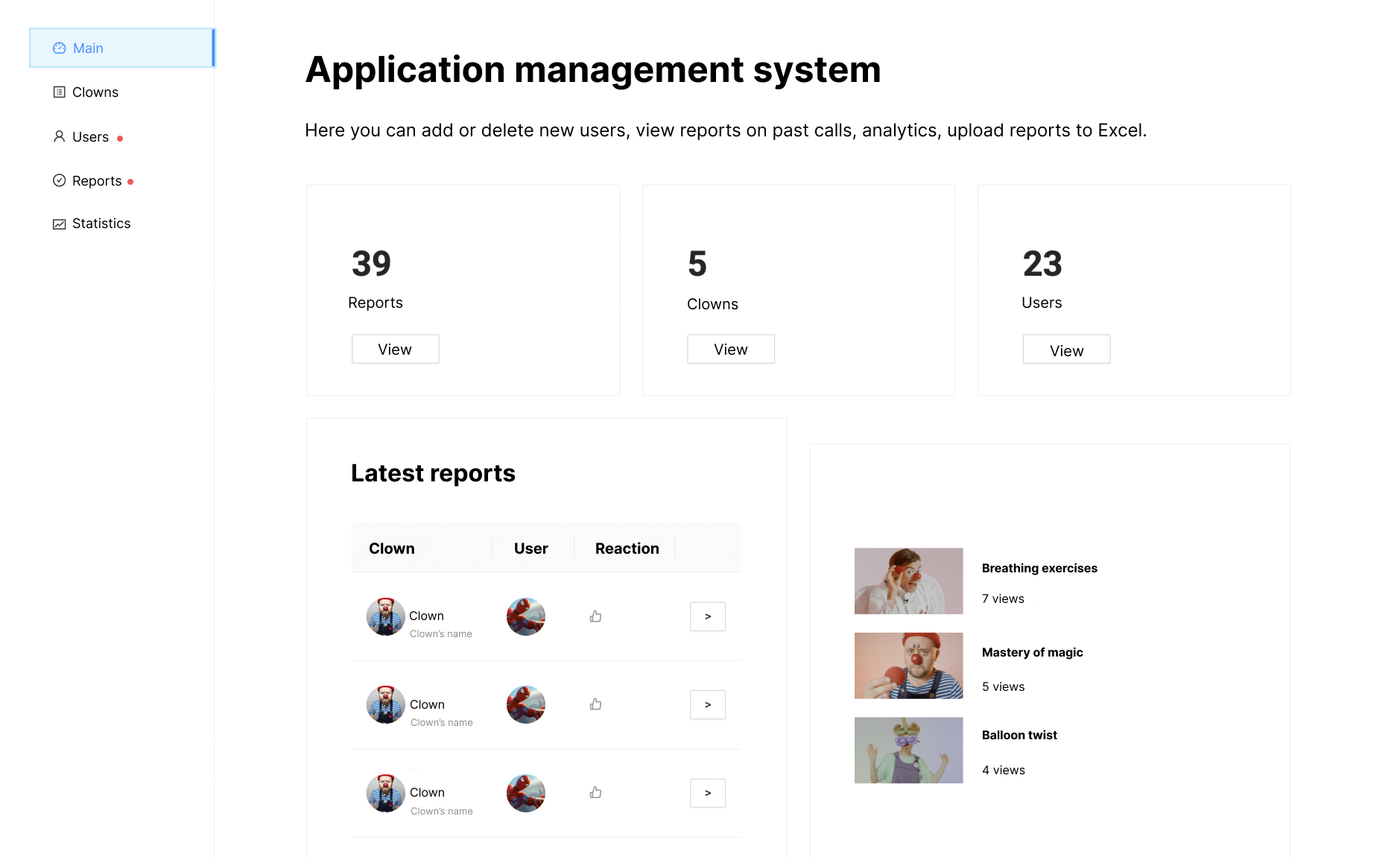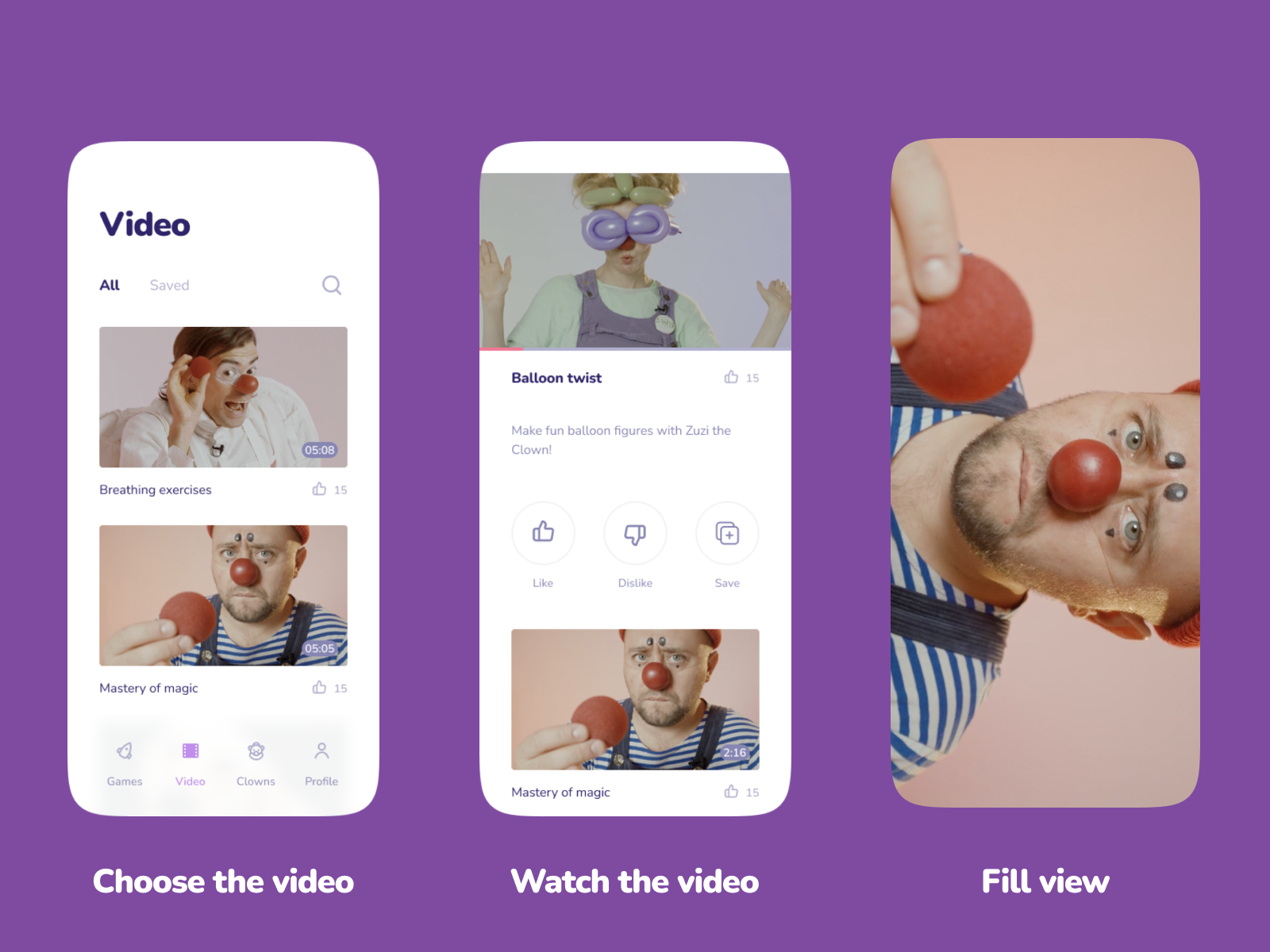 The child can watch videos with the participation of Clowns on the different topics: morning exercises, balloon twisting, magic tricks.